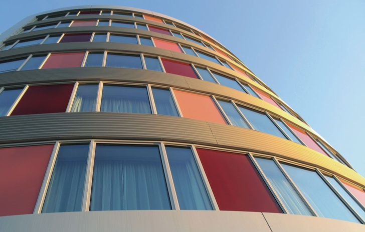 Seit Anfang Oktober steht das 4-Sterne-Hotel Besuchern offen und wartet innen wie außen mit einigen Besonderheiten auf. Dem eleganten, exklusiven Ambiente im Innenraum steht eine reduzierte Fassadengestaltung mit umlaufenden Fensterbändern gegenüber. Blickpunkte in der Fassade sind unterschiedlich rote Glaspaneele. Sie verleihen dem achtstöckigen Gebäudekomplex ein markantes Erscheinungsbild und verbergen die hinter ihnen liegenden Wandelemente – so bleibt der Bandcharakter in der Ansicht durchgängig erhalten. Die Fenster, eine Sonderkonstruktion auf Basis der Wicona Fensterserie Wicline 77, zeichnen sich durch besonders gute Wärmedämm- und Schallschutzeigenschaften aus – für Funktion und Standort des neuen Hotels äußerst relevante Faktoren. Die Fenster und Fassaden erreichen eine Wärmedämmung von 1,5 W/(m²K) und einen Schallschutz bis zu R’W = 45 dB. Dies garantiert den Hotelbesuchern eine ruhige und geschützte Atmosphäre inmitten eines geschäftigen Umfeldes.