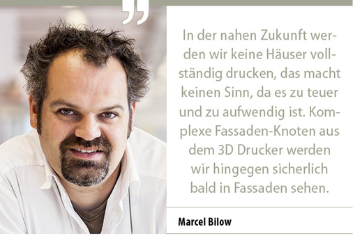 Bilow – (lacht) Ganz klar ist aber auch, dass wir in der nahen Zukunft keine Häuser vollständig drucken werden, denn das macht überhaupt keinen Sinn, da es zu teuer und zu aufwendig ist. Die 3D-Druck-Techniken werden jedoch helfen, Hybridlösungen zu entwickeln, die in der Lage sind bessere Gebäude zu erstellen.