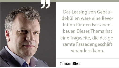 Das Leasing wäre eine Revolution für den Fassadenbauer. Denn nun müsste er sich damit auseinandersetzen, wie er die Leistungsfähigkeit seines (Fassaden-)Produkts auf eine definierte Zeit sicherstellen kann. Momentan sprechen wir über das Fassaden-Leasing mit Banken und den Branchenverbänden, das Thema hat eine Tragweite, die das gesamte Fassadengeschäft verändern kann.