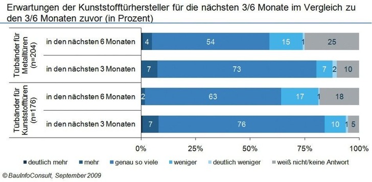 Im September 2009 gaben 350 Hersteller von Metall- und Kunststofftüren den Marktforschern in telefonischen Interviews darüber Auskunft, wie sie die Entwicklung ihres Türbänderabsatzes in den kommenden drei bzw. sechs Monaten einschätzen. 73 Prozent der Metalltür- und 76 % der Kunststofftürproduzenten erwarten, dass in den kommenden drei Monaten gleich viele Türbänder verbaut werden können, wie in den drei Monaten zuvor. In Bezug auf das nächste halbe Jahr glauben allerdings deutlich weniger Türenbauer, dass sie ihr Absatzniveau vom abgelaufenen Halbjahr halten können.