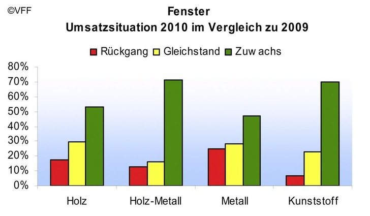 Die Fenster- und Fassadenbranche hat nach langen Jahren der rückläufigen und stagnierenden Marktzahlen in Deutschland Grund zur Freude: Sie schloss das vergangene Jahr mit steigenden Umsätzen und einer zunehmenden Angebotsnachfrage ab. Damit konnte die Branche an die leichte Steigerung des Jahres 2009 (3,6 %) anknüpfen. Laut der aktuellen Konjunkturumfrage des VFF unter seinen Mitgliedsunternehmen, ist für 2010 mit einem Plus von 4,9 % zu rechnen. Geschäftsführer Ulrich Tschorn: „Drei wesentliche Punkte haben zu dieser Entwicklung beigetragen. Das Konjunkturpaket II, die KfW-Fördermittel und der Umstand, dass das Thema ‚Energetische Modernisierung’ beim Kunden inzwischen dauerhaft präsent ist.“
