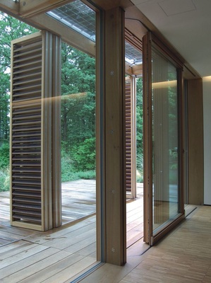 Die raumhohe Verglasung mit dem Fenstersystem „Energate“ von der Ludwig Häußler GmbH ist Teil der thermischen Hülle. Nordseitig wurde das System mit einer Vierfachverglasung (U-Wert 0,3 W/m 2 K), im Süden als Dreifachverglasung mit einem U-Wert von 0,5 W/m 2 K ausgeführt. Das Holzfenstersystem weist einen Purenit-Kern auf und ist teilweise eine Pfosten-Riegel-Konstruktion, teilweise gibt es große Schiebeelemente. Bei geöffneten Lamellen ergeben sich nach Süden hin passive solare Gewinne und für eine Nachtauskühlung im Sommer sind Öffnungselemente gegenüberliegend angeordnet. Zusätzlich sorgt der tiefe Dachüberstand im Süden in dieser Jahreszeit für Verschattung.