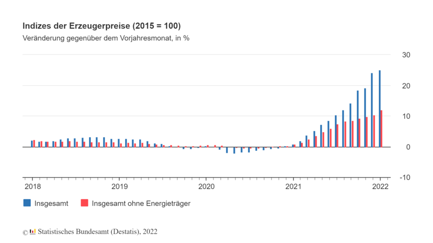 Ohne Berücksichtigung von Energie waren die Erzeugerpreise 12,0 % höher als im Januar 2021 (+2,5 % gegenüber Dezember 2021).