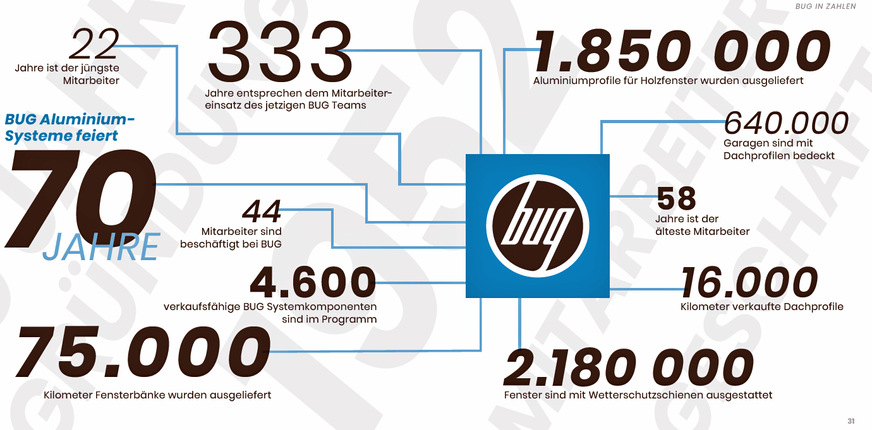 BUG Aluminium-Systeme ist Qualitätshersteller für Fensterbank-, Flachdach- und Fassadensysteme sowie Aluminiumsysteme für Holz-Aluminium-Fenster und Wetterschutzsysteme für Holzfenster. Das 70-jährige Jubiläum ist ein Indiz für die beständige Leistungsfähigkeit und den hohen Qualitätsstandard des Anbieters. So zeigt sich, dass sich die Marke weiterhin am Markt behauptet und stetig ihre Weiterentwicklung vorantreibt. Tradition, Beständigkeit, Wissenstransfer und zukunftsorientierte Systemprodukte zeichnen die Marke BUG Aluminium-Systeme aus.