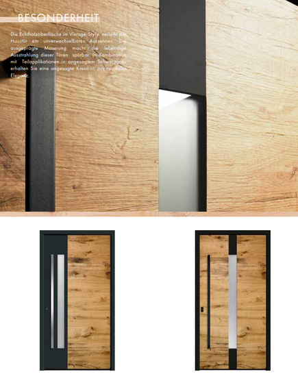 Ab sofort bereichern sieben neue Modelle mit angesagter Echtholzoberfläche im Vintage-Style das Holzhaustüren-Sortiment. Die lebendige Ausstrahlung dieser Türen wird durch die ausgeprägte Maserung auch haptisch zum Erlebnis. In Kombination mit Teilapplikationen in schwarzgrau und den angesagten neuen Stoßgriffen in schwarz matt beeindrucken diese Modelle alle Sinne mit ihrer natürlichen Eleganz. Passend zu den neuen Griffen sind ab sofort auch Rosetten und Innendrücker in schwarz beziehungsweise schwarz matt erhältlich.