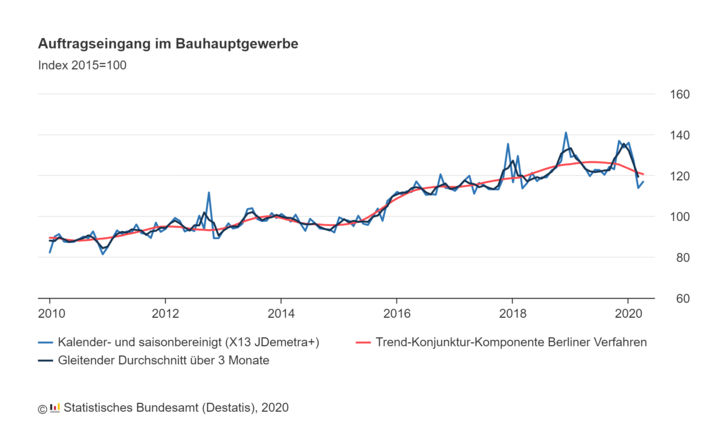 Im Vorjahresvergleich war der reale Auftragseingang im Bauhauptgewerbe im April 2020 kalenderbereinigt 5,3 % niedriger. Gegenüber dem Vorjahreszeitraum sank der reale Auftragseingang in den ersten vier Monaten des Jahres 2020 kalenderbereinigt um 3,6 %. Neben Basiseffekten aufgrund der außergewöhnlich hohen Auftragseingänge zum Jahresbeginn 2019 kann für diese Entwicklung auch ursächlich sein, dass Unternehmen geplante Bauvorhaben aufgrund der wirtschaftlichen Unsicherheit in der Corona-Krise zurückgestellt haben.