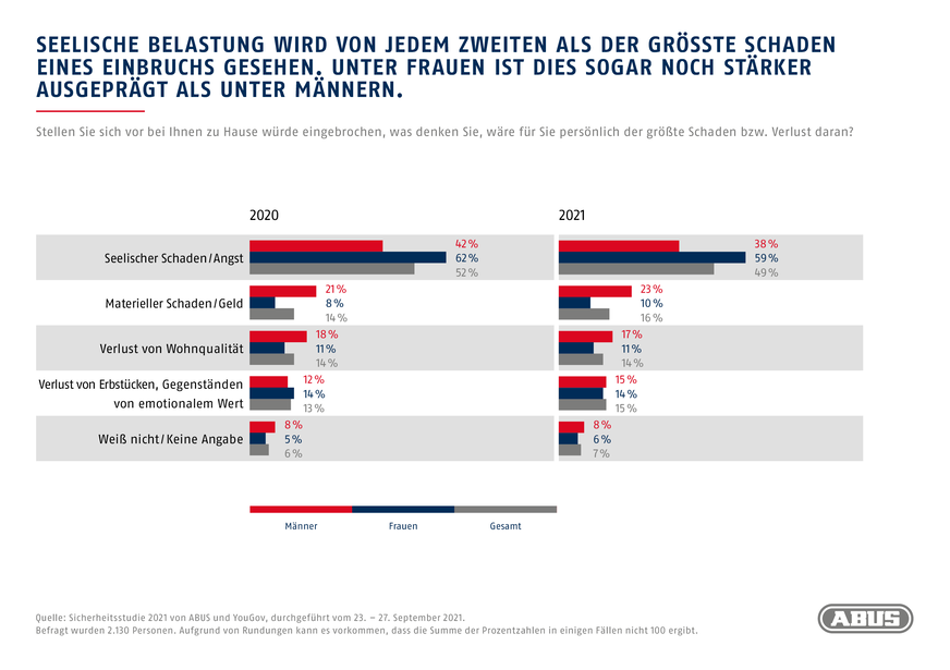 Auf die Fragestellung, vor welchen kriminellen Übergriffen die Befragten am meisten Angst hätten, wird an Stelle zwei der Einbruch in Haus oder Wohnung genannt, während an erster Stelle die Angst vor Gewalt und Körperverletzung steht. „Zum einen haben die Menschen Angst davor, Opfer eines Einbruchs zu werden – zum anderen sind aber in der Realität nur wenige Haushalte davor geschützt“, sagt Michael Bräuer, Leiter Öffentlichkeitsarbeit bei Abus. Die Lücke zwischen Angst und Schutz vor Einbruch ist also erkennbar. „Allerdings zeigt sich auch, dass rund jeder vierte Befragte plant, in den kommenden 12 Monaten in Absicherungssysteme zu investieren.“ Dabei ist es nicht die Angst vor den wirtschaftlichen Schäden oder materiellen Verlusten (16 %), welche die Befragten im Zusammenhang mit Wohnungseinbrüchen am meisten benennen. Stärker im Fokus steht hier eindeutig das Thema der seelischen Folgen, die Einbrüche hinterlassen können – dies wurde von 49 % der Befragten angegeben.