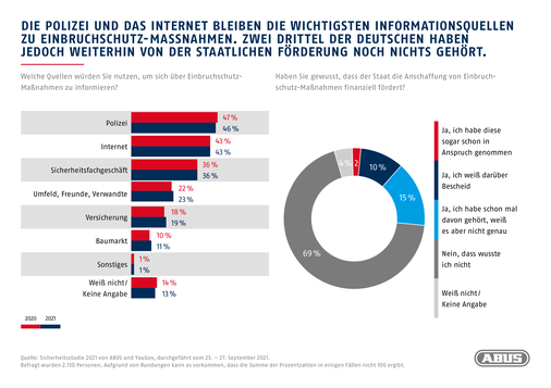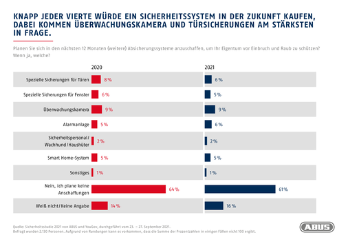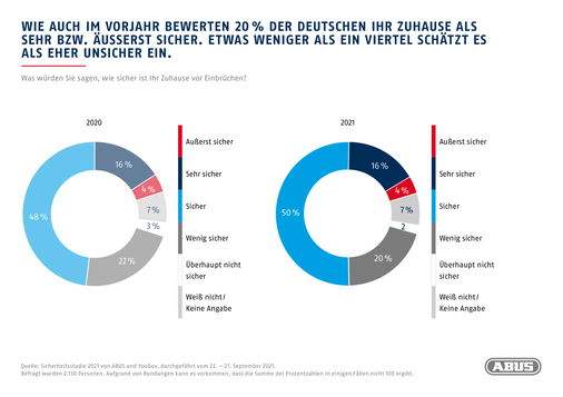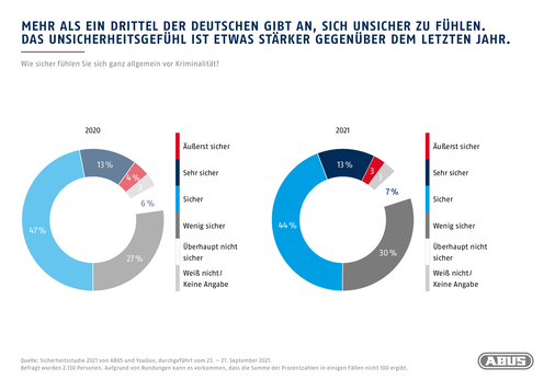 Dies sind wesentliche Erkenntnisse der Sicherheitsbefragung 2021, die das Marktforschungsinstitut YouGov zum zweiten Mal nach 2020 im Auftrag des Sicherheitsexperten Abus durchgeführt hat. Mit dieser repräsentativen Studie sollte das grundlegende Sicherheitsgefühl der Deutschen ermittelt werden. Dafür wurden 2.130 Deutsche im Zeitraum vom 23. bis 27. September 2021 befragt.