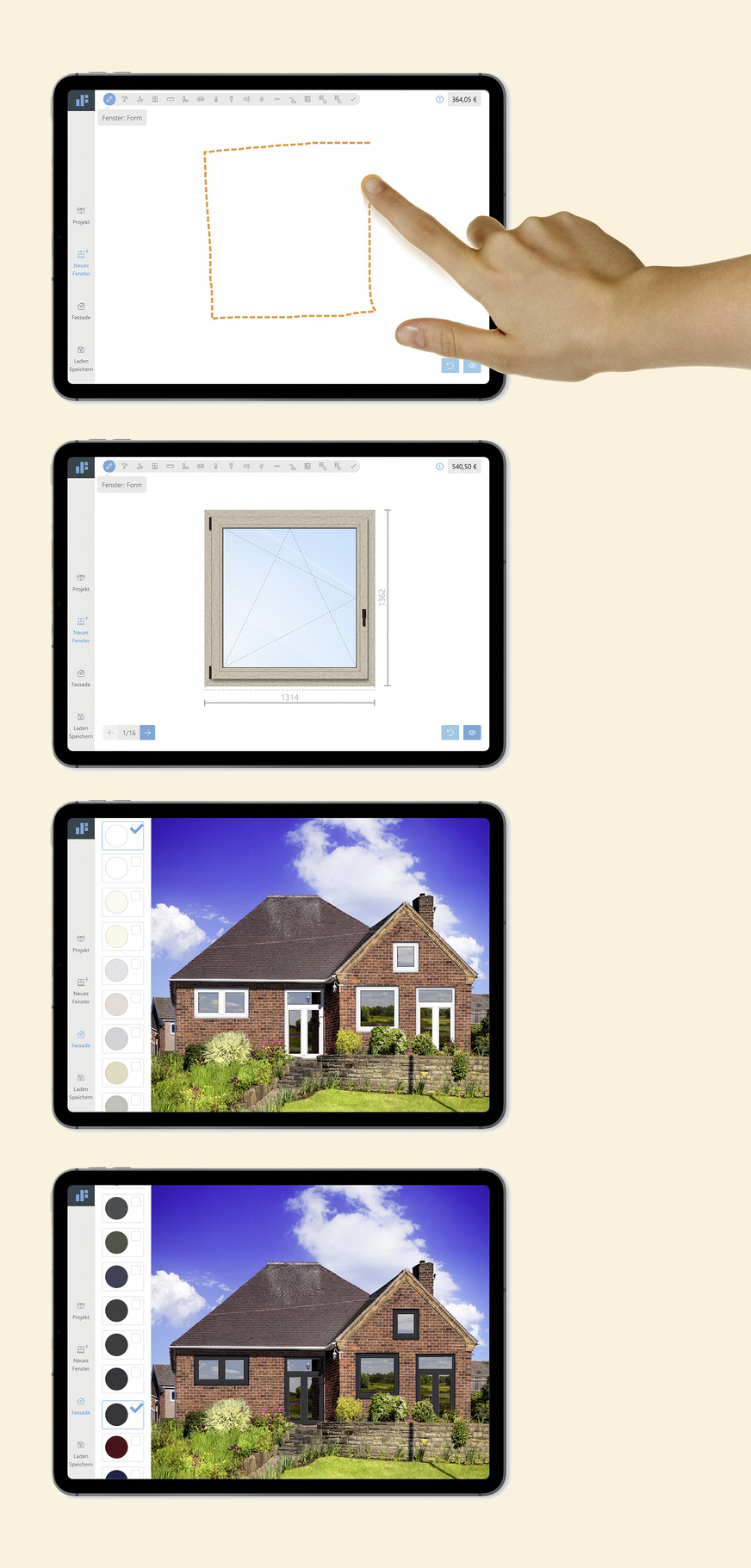 Ivo Vorrath nimmt beim Unternehmensrundgang ein Tablet vom Tisch und öffnet die DF Studio-App. Mit ein paar Handbewegungen zieht er ein Viereck auf dem Display, welches sich blitzschnell in ein realitätsgetreues Fenster verwandelt. Mit zwei weiteren Streichbewegungen teilt er das Fenster horizontal und vertikal. Er zeichnet Dreiecke in die Flügel und legt so die Öffnungsrichtungen fest. Danach wählt er Farben, Sicherheitsstufe und weitere Eigenschaften aus. Bei jeder Auswahl verändert sich auch der angezeigte Preis. Am Ende fügt er einen Rollladen hinzu, welcher durch eine Animation nach unten fährt, sodass der Panzer zu sehen ist. Vorrath wiederholt den Vorgang für zwei weitere Fenster. Danach wählt er ein Bild eines Hauses aus und zieht die Fenster in die Fassade. Mit ein paar Gesten ändert er die Außenfarbe der Fenster, sodass sich der Gesamteindruck der Fassade wandelt. „Wir haben unsere eigene Fensterbau-Software genommen und eine touch-fähige App daraus gemacht, welche unsere Außendienstmitarbeiter künftig vor Ort beim Kunden benutzen können. Der Kunde kann dann seine Fenster sogar selbst zeichnen. Am Ende wird ein Foto der Fassade gemacht, die Fenster eingesetzt und die bevorzugte Außenfarbe eingestellt. Ganz schön cool, oder?“