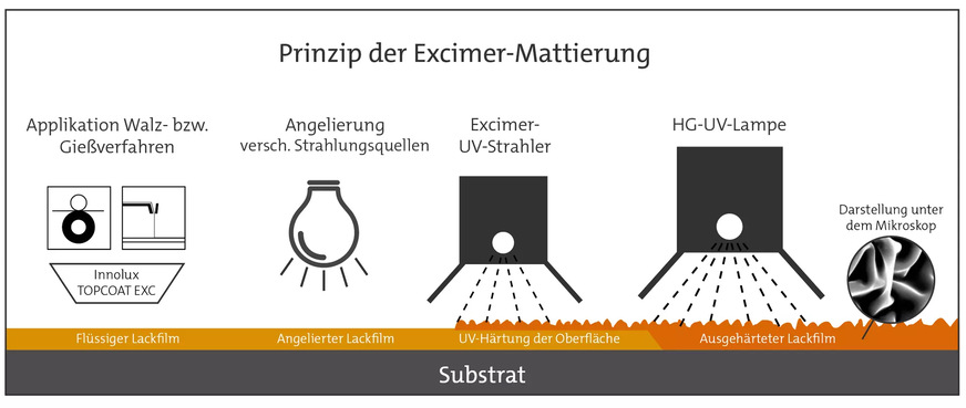 Doch was steckt hinter dem Excimer-Verfahren [Wikipedia: "Die Bezeichnung Excimer ist ein Akronym aus der Kurzform von „excited dimer“ (‚angeregtes Dimer‘)"]: Der Lackfilm wird unter Ausschluss von Sauerstoff mit kurzwelliger Excimer-Strahlung behandelt. Diese Strahlen bewirken eine Mikro-Faltung der obersten Lackschicht: Sie ist weder sicht- noch fühlbar, sorgt durch die Lichtreflexion aber für eine perfekt matte Optik. Die Vorteile: stumpfmatte Glanzgrade von 3 bis 20 ohne Mattierungsmittel und eine extrem kratzfeste, chemikalienbeständige und harte Oberfläche, wie man sie von UV-Lacken gewohnt ist – und das bei höchster Prozesssicherheit.