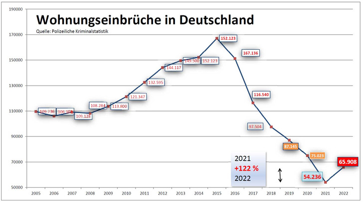 Dennoch liegt die Einbruchzahl weiterhin unter dem Niveau vor der Pandemie, 2019 waren noch 87.145 Einbrüche und Einbruchsversuche erfasst worden.