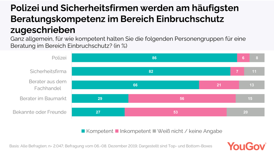 Auch in die Kompetenz von Sicherheitsfirmen vertraut die deutliche Mehrheit der Deutschen (82 %). Etwas seltener (66 %) bewerten die Deutschen die Experten aus dem Fachhandel als kompetent. Der Berater aus dem Baumarkt wird von 29 Prozent als kompetent gehalten. Hier fällt auf, dass fast ebenso viele Befragte (27 %) Freunde oder Bekannte für kompetent halten, wenn es um eine Beratung im Bereich Einbruchschutz geht.
