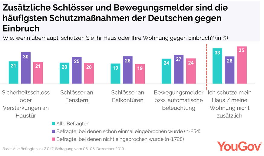 Die Möglichkeiten von zusätzlichem Schutz des eigenen Hauses oder der Wohnung sind vielfältig. Ein Viertel der Bevölkerung setzt unter anderem auf Bewegungsmelder oder automatische Beleuchtung (24 %). Weiter geben die Befragten an, zusätzliche Sicherheitsschlösser oder Verstärkungen an der Haustür (21 %) oder Schlösser an Fenstern (20 %) und Balkontüren (19 %) zu haben. Jeder dritte Deutsche (33 %) hingegen hat keinen zusätzlichen Einbruchschutz.