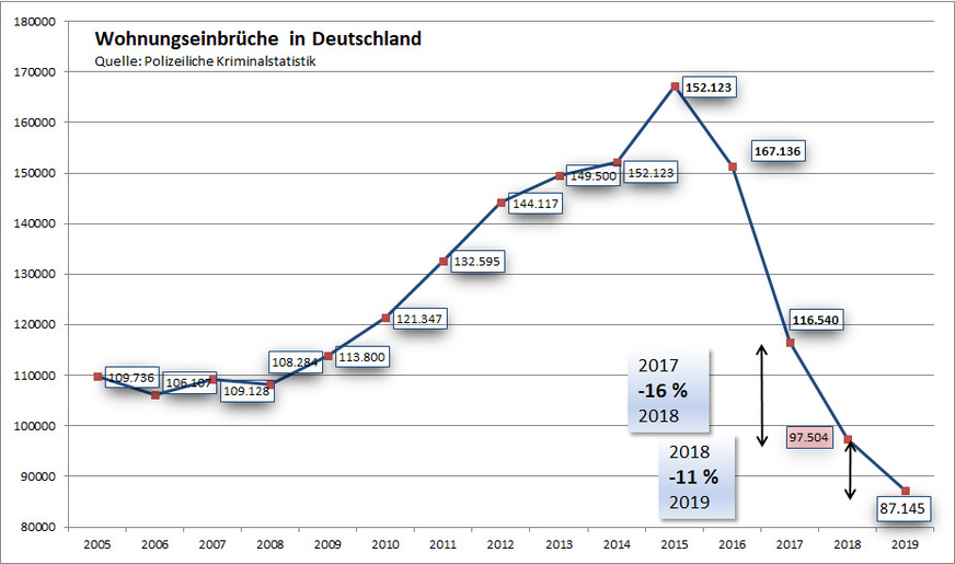 Das Bundeskriminalamt (BKA) verzeichnete einen Rückgang um über zehn Prozent im Vergleich zum Vorjahr. Seit 2015 sind die Fallzahlen beim Wohnungseinbruchsdiebstahl sogar von rund 167.000 auf 87.000 gefallen. Und sie könnten wegen der Coronakrise womöglich weiter zurückgehen, schließlich bleiben wegen der Coronakrise aktuell viele Menschen zuhause und dann wird auch seltener eingebrochen.