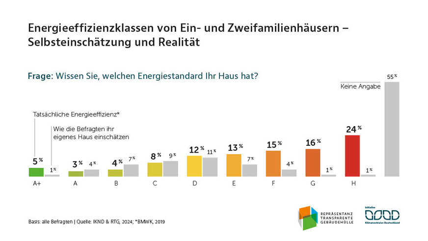 Laut der Umfrage unter über 2.000 Eigentümern von Ein- und Zweifamilienhäusern können zwar 45 % eine Einschätzung zum energetischen Zustand ihres Hauses abgeben (im Vergleich zu 33 % in 2022), doch nur 13 % stufen ihr Haus in die niedrigen Effizienzklassen E bis H ein. Das Bundeswirtschaftsministerium gibt jedoch an, dass tatsächlich 68 % der Häuser in diese Klassen fallen. Rund 80 % derjenigen, die in den letzten Jahren nicht saniert haben, sehen keinen Bedarf.