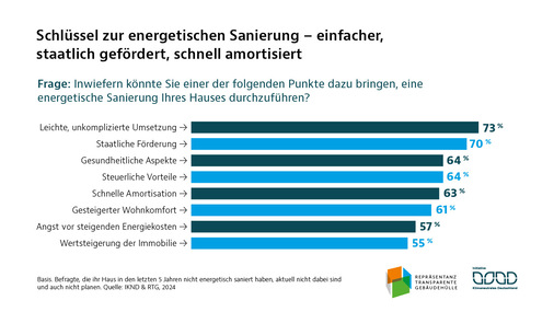 Viele Hausbesitzer sind grundsätzlich offen für Sanierungsmaßnahmen, sehen aber Verbesserungsbedarf bei den staatlichen Förderprogrammen. 55 % der Befragten empfinden die derzeitigen Förderungen als unattraktiv. Gleichzeitig würden über 70 % der Nicht-Sanierer eine Modernisierung in Betracht ziehen, wenn die Förderung verbessert würde. Handwerker bleiben die wichtigste Informationsquelle (72 %), gefolgt von Energieberatern (36 %).