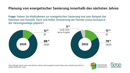 Im Vergleich zur Befragung, die vor zwei Jahren durchgeführt wurde, planen deutlich weniger Hausbesitzer energetische Sanierungen. Nur 12 % der Befragten, die bisher nicht saniert haben, wollen dies innerhalb der nächsten 12 Monate konkret umsetzen. Finanzielle Unsicherheiten, hohe Baukosten und die politischen Diskussionen um das Gebäudeenergiegesetz (GEG) sind die Hauptgründe für die Zurückhaltung.