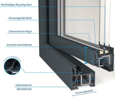 Durch eine besondere Systemkonstruktion erreicht das 82,5 mm-System mit durchgängig drei Dichtebenen „Topleistungen in Schall- und Wärmedämmung sowie bei der Statik“, so das Unternehmen. Verstärkungen innerhalb der gesamten Systemkonstruktion sowie der Einsatz von Klebetechnologien erhöhen die Stabilität: Durch das Verkleben der Scheibe mit dem Flügelprofil wird die Steifigkeit der Glasscheibe in den Flügel übertragen, das gesamte System in sich stabiler. Ein fester Mitteldichtungssteg sorgt von vornherein für optimierten Einbruchschutz.