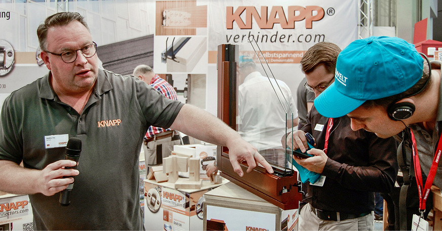 Auf dem Stand von Knapp sprach Elisabeth Kerschdorfer-Knapp erfreut davon, „dass die Gruppe am Ende doch so groß war“ und dankte Guide „Reinhold Kober und der GLASWELT für diese neue Möglichkeit eines Stand-Vortrags“. Den hielt bei Knapp Key Account und Experte für Fenster und Fassade Matthias Flex. Er konzentrierte sich auf zwei zentrale Punkte. „Stellen Sie sich vor, Sie haben eine moderne Glasüberdachung und wollen keine Kopfbänder und Querverstrebungen sehen.“ Mit diesen Worten stellte er die neue Produktlinie T-Joint für die biegesteife Rahmenecke vor.