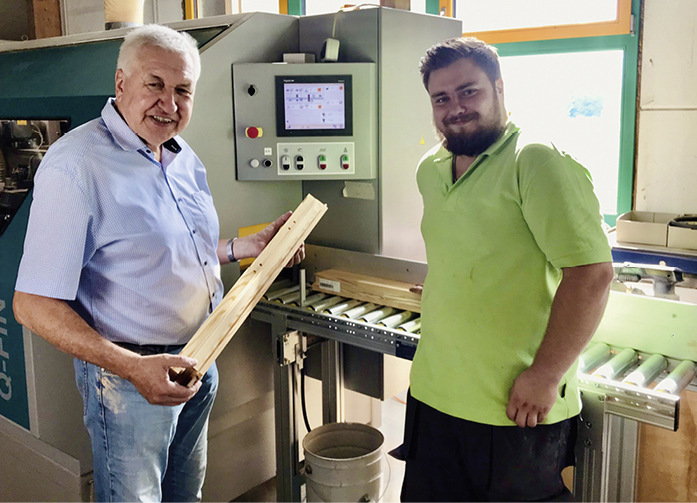 Mit wenigen Berührungen auf dem großen Touchscreen wählt der junge Tischler die notwendigen Einstellungen der mehrere Meter umfassenden Anlage. Hier sieht man, dass durch die Vorprogrammierung verschiedener Holzgeometrien (Typen) die Bedienung sehr einfach ist. Anhand dieser Tastendrücke stellen sich alle Schleifaggregate mittels Servomotoren präzise auf den Querschnitt des Einzelteiles ein. Domenik Hinz, Junggeselle in der Tischlerei Pötschke im sächsischen Löbau, greift die nächste Kantel und „schiebt sie durch“, wie sein Chef Wilfried Pötschke die problemlose Maschinenbedienung an der Q-Fin umschreibt. Durch die Zuführöffnung der Maschine, die auch ggf. falsche Dimensionen eines zugeführten Teils erkennt, zieht der patentierte Vorschub präzise die Teile in die Q-Fin ein.