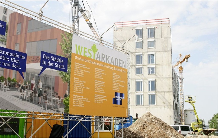 Ortstermin auf Freiburgs größter Baustelle: Kai Mätz, Projektleiter der Firma Hilzinger stattet mich mit Helm und Weste aus, dann geht es zusammen mit Helmut Hilzinger und Marketingleiter Harald Schmidt auf die Baustelle. Auf dem Baugrundstück mit einer Größe von 19200 m² wird ein ganz neues Stadtquartier mit Wohn- und Gewerbeimmobilien errichtet – „Westarkaden“ genannt. Die eingesetzten Fenster machen zwar in Anbetracht der Gesamtprojektsumme von rund 90 Mio. Euro nur einen kleinen Teil aus, dennoch: Der Auftrag über rund 3700 Fenstereinheiten (Hilzinger zählt je ein Flügelelement mit Isolierglasfüllung als eine Fenstereinheit) und 136 Wohnungseingangstüren stellt auch für die Unternehmensgruppe aus Willstätt ein recht ordentliches Umsatzvolumen von ca. 1,7 Mio. Euro dar.