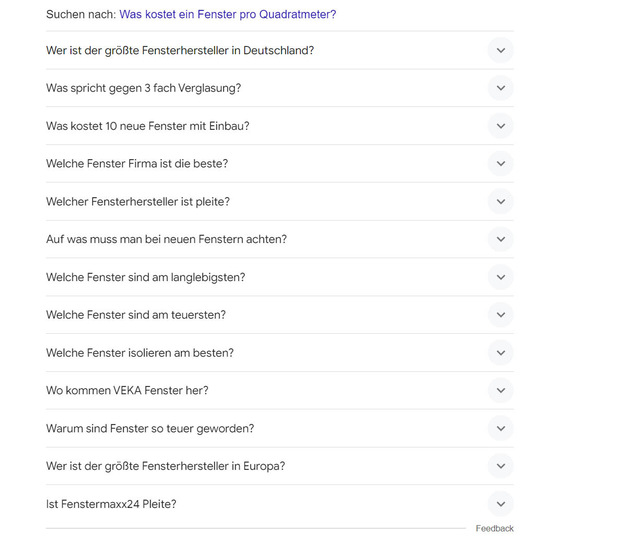 Antwort von Google: „Highlights sind die deutschen Profilhersteller Kömmerling und Schüco, der Fensterhersteller FeBa Fensterbau GmbH und der Fenster-Onlineshop Fensterhandel.de“.