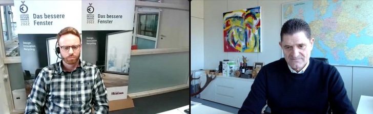 Fensterbauer Jonas Herr und CSO Wolfgang Sandhaus von Salamander im Video-Call.