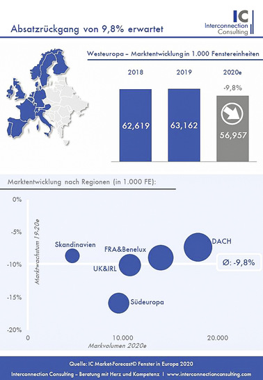 Der Absatz am westeuropäischen Fenstermarkt wird 2020 um 9,8 % zurückgehen. Der Absturz der Branche, verursacht durch die Covid-19-Krise wird auch 2021 ungebremst fortgesetzt. Bis das Marktvolumen das Vorkrisenniveau wieder erreicht haben wird, werde es noch lange dauern, so eine Studie von Interconnection Consulting. Bis 2023 jedenfalls wird das Marktvolumen in den untersuchten Märkten von 19 Mrd. Euro auf 17,9 Mrd. Euro zurückgehen.
