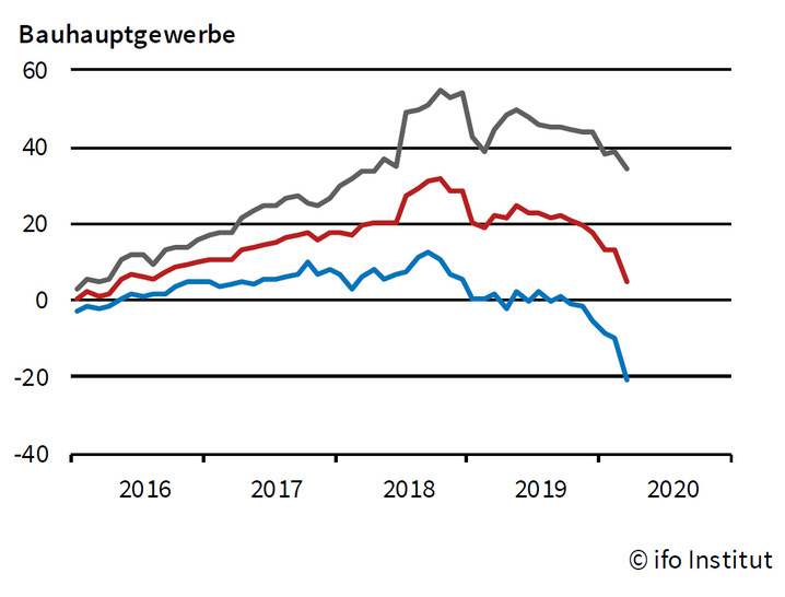 Im Bauhauptgewerbe ist der Index vergleichsweise moderat gesunken. Die Bauunternehmen sind gegenwärtig mit ihrer aktuellen Lage noch sehr zufrieden. Der Ausblick hat sich jedoch deutlich verschlechtert.