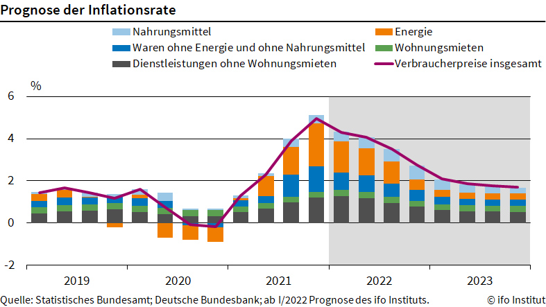 „Die Unternehmen geben sie die gestiegenen Kosten für Energie sowie bei der Beschaffung von Vorprodukten und Handelswaren weiter“, sagt Wollmershäuser. Selbst wenn sich der Anstieg der Energiepreise in den kommenden Monaten nicht fortsetzten sollte und die Börsenpreise für Erdgas, Strom und Rohöl unverändert blieben, sorgt das noch eine Zeitlang für hohe Inflationsraten: Denn der Anstieg der Verbraucherpreise wird immer im Vergleich zum Vorjahr gemessen; demnach müssten die Verbraucher in diesem Jahr im Schnitt 10 Prozent mehr für Energie ausgeben. Die Lohnkosten dürften hingegen die Inflation nicht zusätzlich antreiben. „Die bisherigen Lohnverhandlungen deuten auf keine Lohn-Preis-Spirale hin. Wir erwarten, dass die Tariflöhne in diesem und im kommenden Jahr um knapp zweieinhalb Prozent zulegen. Das wäre dann so stark wie im Durchschnitt der Jahre vor der Coronakrise“, sagt Wollmershäuser.