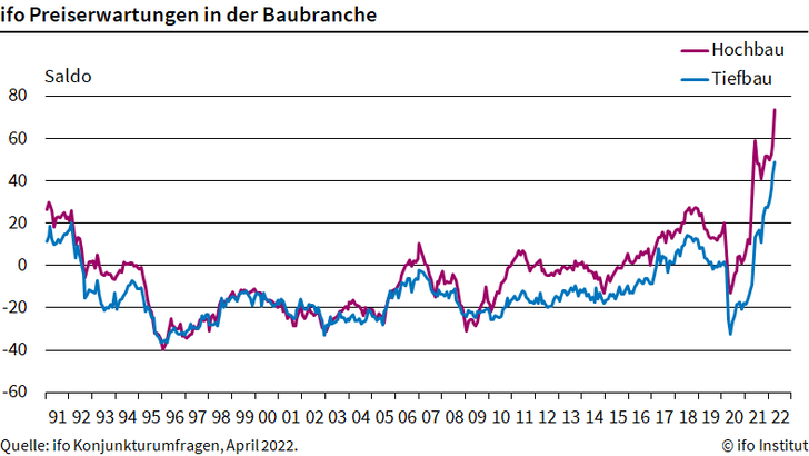 Im Hochbau zeigten sich im April 54 % der Betriebe von Lieferengpässen betroffen, nach 37 % im März. „Das sind Höchststände seit Beginn der Zeitreihe 1991“, sagt ifo-Forscher Felix Leiss. Auch die Geschäftserwartungen haben sich nochmal verdunkelt. Im Hochbau notierten sie bei minus 47 Punkten, das ist ebenfalls der tiefste Stand seit 1991. Im Tiefbau waren es sogar minus 49 Punkte.