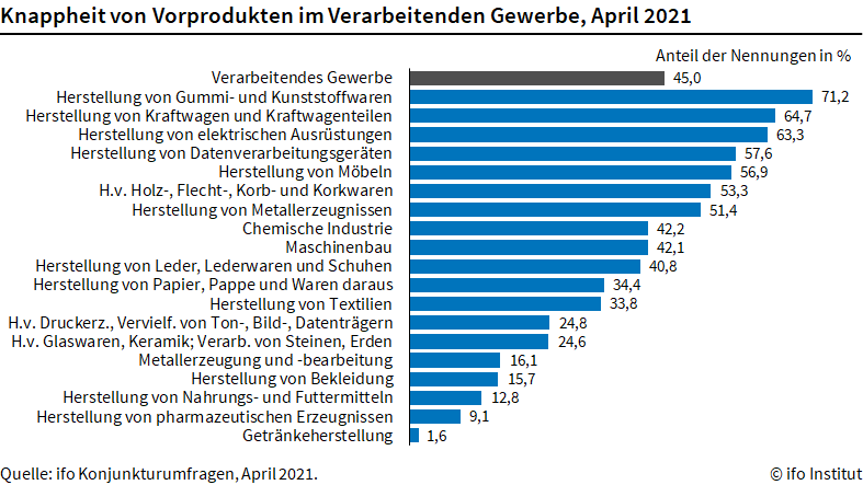Seitenblick: Einige Branchen dagegen waren von dem Problem kaum berührt: 9,1 Prozent der Pharmafirmen spürten laut ifo Materialknappheit und nur 1,6 Prozent der Getränkehersteller. Die Frage nach den Vorprodukten stellt das ifo Institut alle drei Monate. Ende März blockierte das Containerschiff Ever Given tagelang den Sueskanal und damit Importe aus Asien, weil es sich in der Fahrrinne quergestellt hatte. Außerdem sind derzeit beispielsweise Computerchips und Holz knapp.