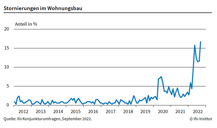 Im September waren 16,7 % der befragten Unternehmen davon betroffen, nach 11,6 % im Vormonat. Das ergaben die Umfragen des ifo Instituts. „Aufgrund der explodierenden Material- und Energiepreise sowie der steigenden Finanzierungszinsen ist die Planungssicherheit dahin. Die Baukosten steigen immer weiter. Für einige Bauherren ist das alles nicht mehr darstellbar, sie stellen Projekte zurück oder ziehen ganz die Reißleine“, sagt ifo Forscher Felix Leiss.