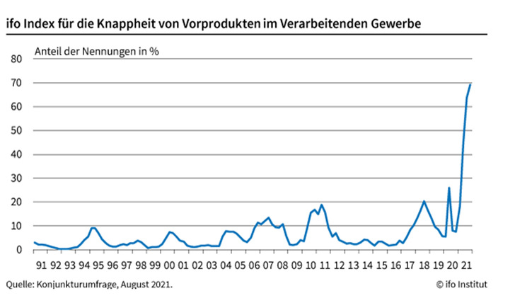 Die Zahlen gehen aus einer Umfrage des ifo Instituts hervor. „Für die Produktion […] bleibt das nicht ohne Folgen. Die Beschaffungskrise stellt eine reale Gefahr für den Aufschwung dar“, sagt der Leiter der ifo Umfragen, Klaus Wohlrabe. Als Konsequenz wollen immer mehr Unternehmen die Preise erhöhen.