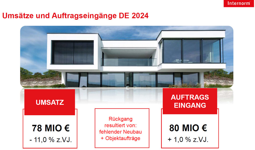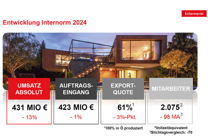 Internorm erzielte im Geschäftsjahr 2024 einen Umsatz von 431 Millionen Euro, was einem Rückgang von 13% entspricht. Beim Auftragseingang hingegen konnte das Unternehmen mit 423 Millionen Euro nahezu den Vorjahreswert erreichen. Besonders erfreulich entwickelte sich das Geschäft im Heimatmarkt Österreich, wo der Auftragseingang gegen den Trend um 8% stieg und Internorm seinen Marktanteil um 6,5% ausbauen konnte.