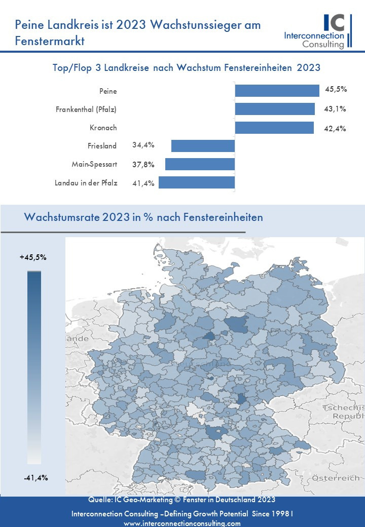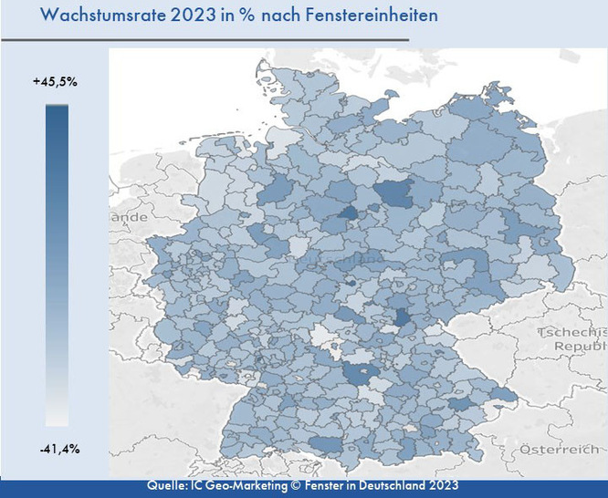 Die vier Bundesländer, nämlich Bayern, Nordrhein-Westfalen, Baden-Württemberg und Niedersachsen, in denen sich 88 % des Fenstermarktes in diesem Segment konzentrieren, entwickeln sich im Krisenjahr 2023 relativ erfolgreich. Insgesamt betrug der Rückgang beim Fensterabsatz in diesen Bundesländern 3,9 %.