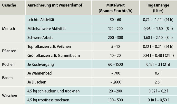 Ein 4-Personen-Haushalt produziert pro Tag zwischen 8 und 15 Liter Wasserdampf (siehe Tabelle). Diese Feuchtigkeit ist durch personenabhängige und/oder personenunabhängige Maßnahmen abzuführen.