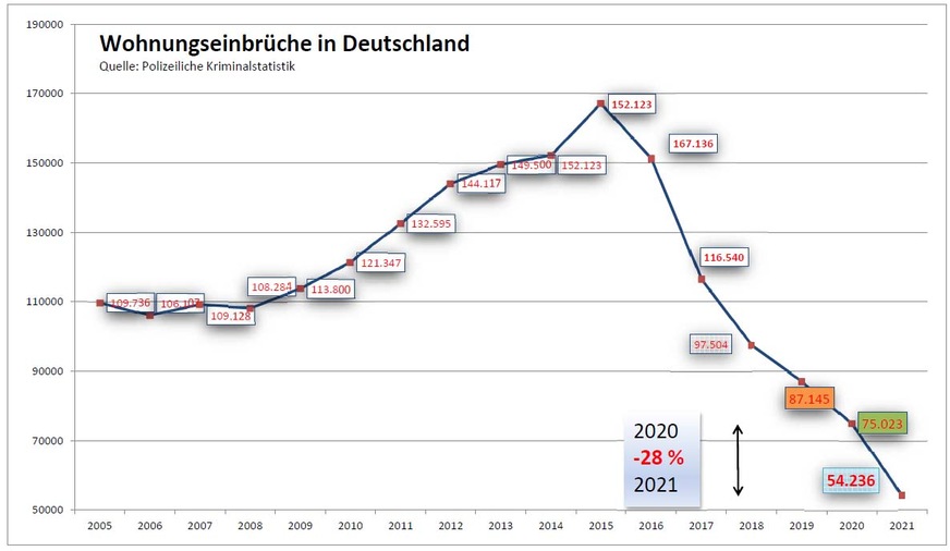 Jedenfalls ist in der Kriminalstatistik in der Sparte „Wohnungseinbruchdiebstahl“ ein Rückgang um 28 % auf mehr als 54.000 Fälle notiert. Im Jahr zuvor waren es mehr als 75.000 und auch damals konnte man einen erheblichen Rückgang der Fallzahlen verkünden. Zum Vergleich: 2016 hatte die Polizei mehr als 150.000 Einbrüche in Wohnungen festgestellt.