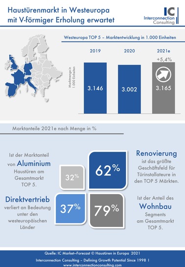 Das Wohnsegment ist mit 79% wichtigster Absatzmarkt für Haustüren und der Renovierungssektor hat mit 62% Marktanteil gegenüber dem Neubausegment weit die Nase vorne. Andererseits tut sich das Marktsegment des Nicht-Wohnbaus in allen untersuchten Regionen schwerer, nach der Krise wieder in die Gänge zu kommen. Aufgrund von Preissteigerungen wird der Umsatz in den fünf Ländern 2021 mit knapp 11 % noch viel stärker steigen ansteigen als der Absatz.