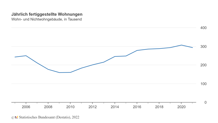 2021 wurden in Deutschland 293.393 Wohnungen fertiggestellt. Das waren 4,2 % weniger als im Vorjahr. Damit fiel die Zahl wieder auf das Niveau von 2019 (2020: 306.376). Eine Zahl lag im letzten Jahr allerdings auf Rekordniveau.