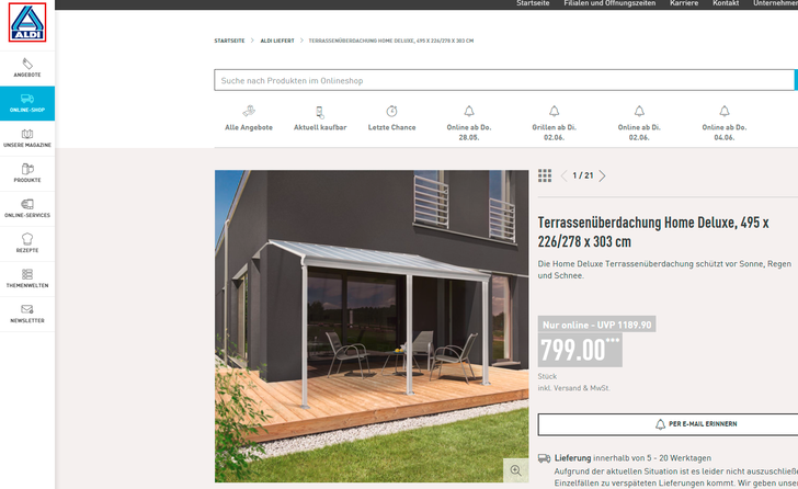Eine Terrassenüberdachung für schlappe 800 Euro vom Discounter Aldi. Da muss man doch einfach zugreifen, oder? Wenn das Wörtchen wenn nicht wäre. Oder wenn man vorher die Montageanleitung einmal lesen würde. Dort stehen nämlich einige interessante Hinweise drin – zudem wird dem Käufer auferlegt, vor der Nutzung des Terrassendaches den Wetterbericht zu beachten.
