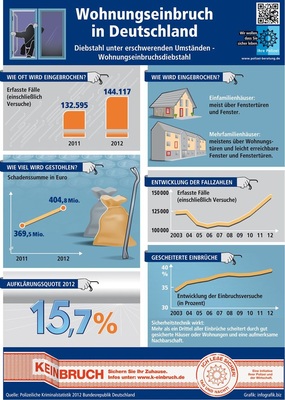 Waren es im Jahr 2011 noch 132595 Fälle, wurden im letzen Jahr 144117 Fälle einschließlich der Einbruchsversuche erfasst. Das ist ein Anstieg von 8,7 Prozent; die Aufklärungsquote lag lediglich bei 15,7 Prozent. Die Einbrecher verursachten dabei einen Schaden von 404,8 Mio. Euro. Der Gesamtverband der Deutschen Versicherungswirtschaft (GDV) geht sogar davon aus, dass der Versicherungsschaden 2012 rund 470 Mio. Euro beträgt. Das wären dann 50 Mio. Euro mehr als noch im Jahr zuvor. Jörg von Fürstenwerth, Vorsitzender der GDV-Hauptgeschäftsführung: „Einbrechern wird ihr Handwerk noch immer zu leicht gemacht. Viele Häuser und Wohnungen sind nicht ausreichend gegen Einbruch gesichert.“ Eingebrochen wurde meist über leicht erreichbare Fenster und Wohnungs- bzw. Fenstertüren. Dabei könne der Einsatz von Sicherheitstechnik in vier von zehn Fällen die Straftat verhindern.