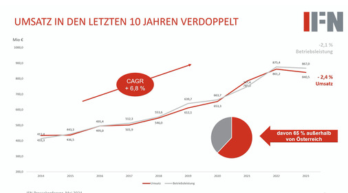 Der deutschsprachige Fenstermarkt ging mengenmäßig 2023 um über elf Prozent zurück, wertmäßig um gut fünf Prozent. „In Anbetracht der Branchenlage blicken wir auf ein für uns sehr zufriedenstellendes Jahr zurück. Unsere Umsatzentwicklung im vergangenen Jahrzehnt kannte nur die rasante Aufwärtsbewegung. Dass wir nun in einem rückläufigen Markt und global herausfordernden Zeiten Stabilität bewiesen haben, macht uns stolz und war nur durch unseren starken Zusammenhalt innerhalb der IFN-Familie möglich“, fasst Finanzvorstand Johann Habring zusammen.