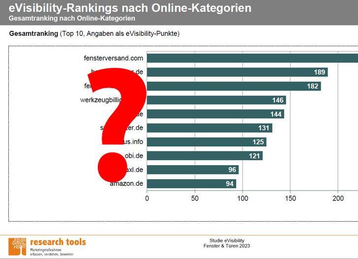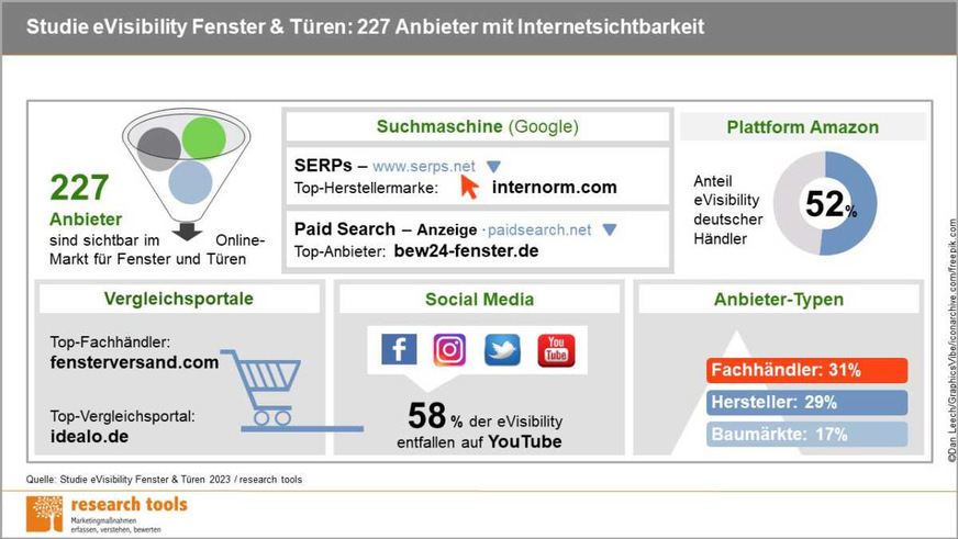 Die „Studie eVisibility Fenster & Türen 2023“ von research tools untersucht auf 87 Seiten die Präsenz der Top 100-Anbieter für Fenster und Türen in fünf Onlinekategorien. Damit zeigt die Studie die Sichtbarkeit der Anbieter im Internet auf und gibt einen umfassenden Wettbewerbsüberblick. Ein Ranking eVisibility listet diese Anbieter unter Berücksichtigung der Kategorie- und Gesamtpunktzahl. Insgesamt 227 Anbieter sind sortiert nach Rängen.