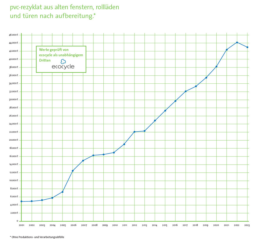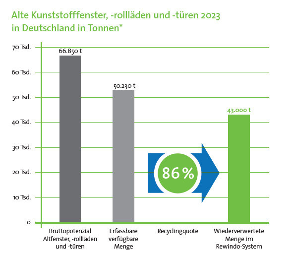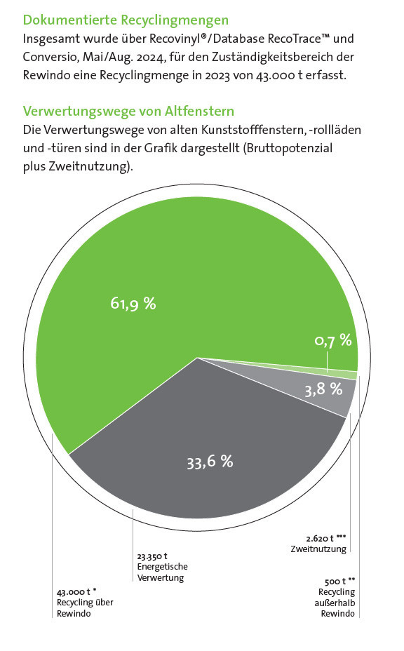 Die Rewindo GmbH, Fenster-Recycling-Service aus Bonn, hat die Recyclingzahlen aus dem letzten Jahr bilanziert. Trotz der Herausforderungen durch steigende Preise, hohe Energiekosten und eine schwache Baukonjunktur konnten immerhin 136.000 Tonnen PVC recycelt werden. Die Zahlen umfassen sowohl PVC-Altfenster, -türen und -rollläden als auch PVC-Profilabschnitte aus der Produktion. Die Post-Consumer-Verwertungsmengen in Form von PVC-Rezyklaten bei den Rewindo-Recyclingpartnern betrugen 43.000 Tonnen. Erstmals seit Gründung des Altfensterrecyclingsystems im Jahr 2002 konnte kein weiterer Anstieg der Recyclingmenge verzeichnet werden. Besonders bemerkenswert ist die Recyclingquote von 86 %, die einen wichtigen Beitrag zum Klimaschutz leistet. Sie errechnet sich aus dem Verhältnis der erfassbaren verfügbaren PVC-Altfenster, -türen und -rollläden zur tatsächlich werkstofflich recycelten und wiederverwerteten Menge. „In einem schwierigen Marktumfeld ist dieser geringe Rückgang gegenüber dem Vorjahr ein respektables Ergebnis“, so Rewindo-Geschäftsführer Michael Vetter.
