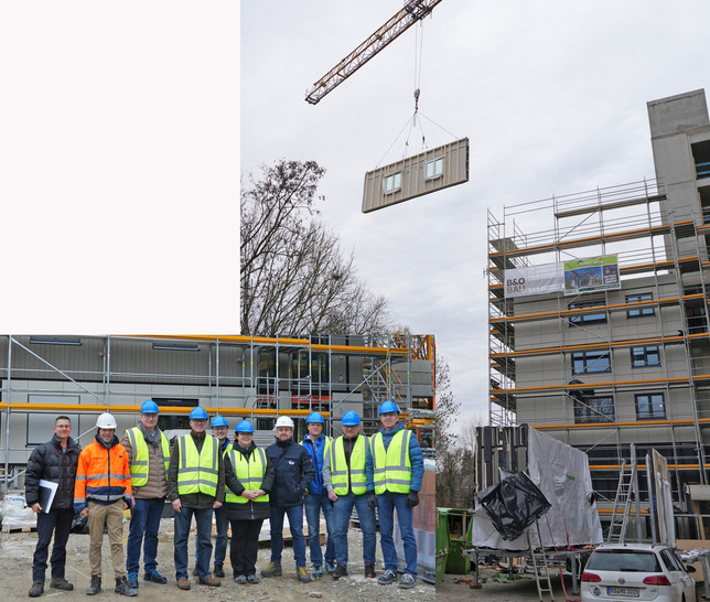Der Baustellenbesuch im November zeigte eindrucksvoll, dass es bei dieser Gebäudeart viel Erfahrung und Know-How braucht. Standardelemente können nicht einfach vor eine bestehende Hauswand gestellt werden, sondern die Fassade musste individuell geplant werden. Vor allem die Ebenheits-Toleranzen (die in der Praxis oft 50 mm und mehr betragen) müssen ermittelt und konstruktiv berücksichtigt werden. Um einen bauphysikalisch und brandschutztechnisch problematischen Hohlraum zu vermeiden, konnten die Fassadenelemente deshalb nicht vorab im Werk gedämmt werden, sondern wurden vor Ort mit Mineralfasern ausgeblasen. Weitere anspruchsvolle Montagedetails ergeben sich durch die statische Lastabtragung der neuen Holzfassaden und den Außenwänden der Aufstockung sowie die Einbindung der Stahlkonstruktion für die geplanten Vorsatzbalkone. Bereits auf der Baustelle wurden von den Bauexperten von B & O, Huber & Sohn und ift Rosenheim konstruktive Verbesserungen sowie eine einfachere Genehmigung durch geeignete Prüfnachweise diskutiert. Es wurde vereinbart, die Zusammenarbeit nach Abschluss des Bauvorhabens fortzusetzen. Das ift Rosenheim kann Planer, Generalunternehmer und Hersteller in Zukunft unterstützen, denn es verfügt in allen relevanten Themenfeldern (Bauphysik, Schall-/Brandschutz, Befestigung, Abdichtungssystemen und Montagetechnik) über Kompetenz (davon 80 Mitarbeiter mit holztechnischer Ausbildung), langjährige Erfahrungen und entsprechende Prüfeinrichtungen.