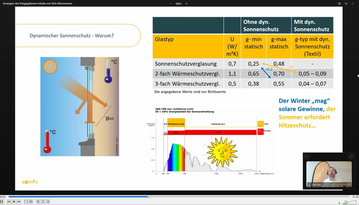 Dirk Mommaerts, Leiter Objektberatung bei Somfy Central Europe (D/A/CH) geht auf den dynamischen Sonnenschutz im Wohnbau ein und erläutert die Abgrenzung zum statischen Sonnenschutz wie Sonnenschutzverglasungen.