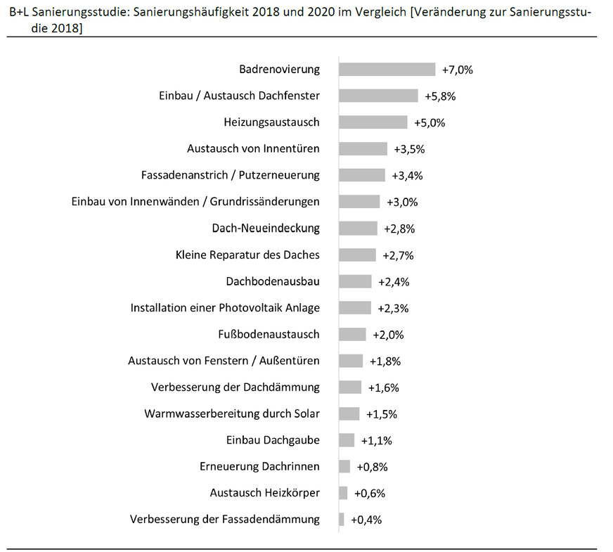Die B+L Sanierungsstudie hat in diesem Jahr insgesamt 22 Maßnahmen bzw. Gebäudeteile im Detail untersucht. Neu hinzugekommen sind mit der aktuellen Ausgabe u. a. die Installation von SmartHome-Lösungen. Die Sanierungsstudie erscheint alle zwei Jahre und wurde erstmalig im Jahr 2010 erhoben. Für die Studie wurden über 1.000 private Sanierer in einer Onlinebefragung zu den durchgeführten Maßnahmen, Budgets, Informationsquellen, etc. befragt. Eine telefonische Befragung von Unternehmen der Wohnungswirtschaft (Deutsche Wohnen, Vonovia, LEG Immobilien, etc.) ist die Datenbasis für die ergänzenden Informationen zur Sanierungsaktivität der deutschen Wohnungswirtschaft.