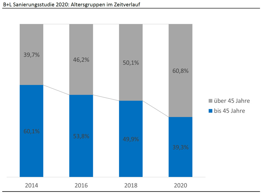 In den letzten 6 Jahren ist der Anteil der Sanierer, die älter als 45 Jahre sind, von 40 % im Jahr 2014 auf 61 % 2020 gestiegen. Während 2014 noch die jüngere Zielgruppe der Käufer (und Sanierer) von Bestandsimmobilien die primäre Zielgruppe im Bereich der privaten Sanierungsmaßnahmen war, sind aktuell die deutlich älteren Eigenheimbesitzer die zentralen Akteure am Sanierungsmarkt. Diese sanieren i.d.R. nicht im Zusammenhang mit dem Kauf einer Immobilie, sondern aufgrund von Verschleiß bzw. verfolgen mit den Maßnahmen die Erhöhung des Wohnkomforts oder die Schaffung von Barrierefreiheit für den nächsten Lebensabschnitt.