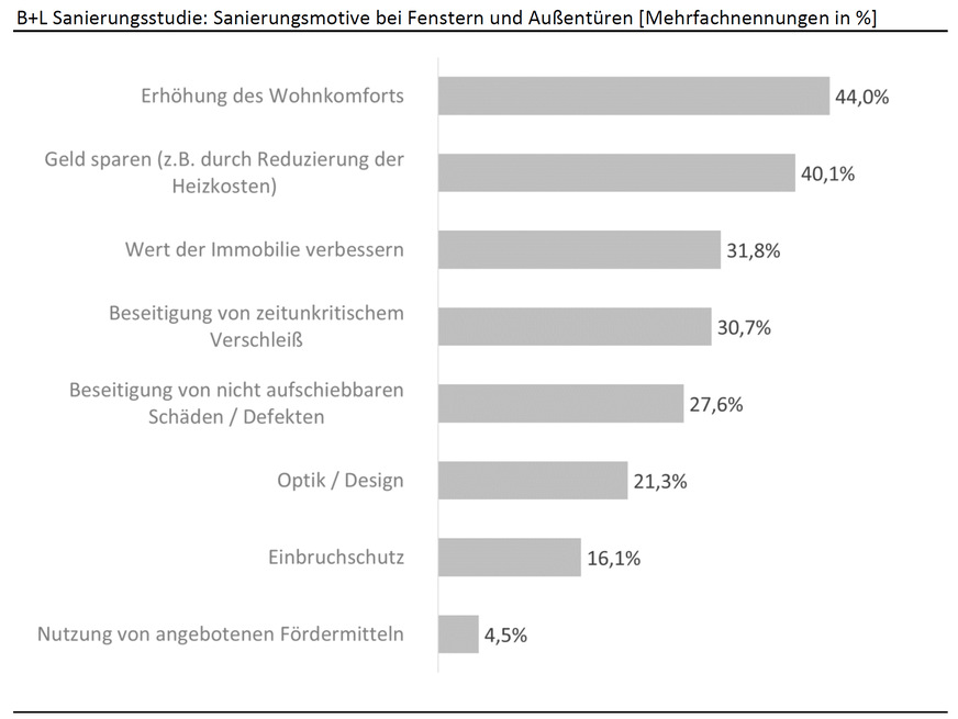 Für die Sanierer von Fenstern und Außentüren zählen dabei im Vorfeld der Maßnahme insbesondere zwei Aspekte: Zum einen werden Fenster und Außentüren ausgetauscht, um den Wohnkomfort zu erhöhen. Dies haben in der B+L Sanierungsstudie 44 % der Sanierer, die Fenster oder Außentüren ausgetauscht haben, geantwortet. Zum anderen spielen für viele Sanierer auch Energiekosten eine wichtige Rolle: 40 % der Sanierer haben angegeben, dass sie mit der Maßnahme Kosten einsparen wollen. Während Schäden und Verschleiß ebenfalls wichtige Sanierungsmotive sind, ist der Einbruchschutz für weniger als ein Fünftel der Sanierer ein Anlass für den Austausch von Fenstern oder Außentüren.